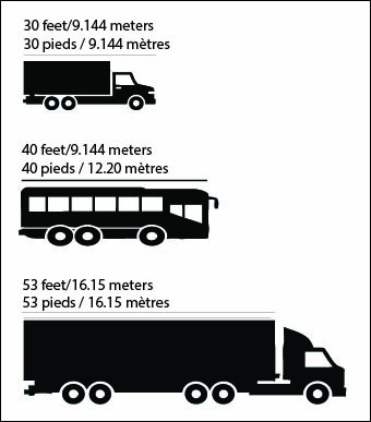 The graphic below shows a comparison of some of the different vehicle size: a smaller box delivery truck, a transit bus, and truck with trailer. A truck with 53-foot trailer is almost twice the length as a transit bus.